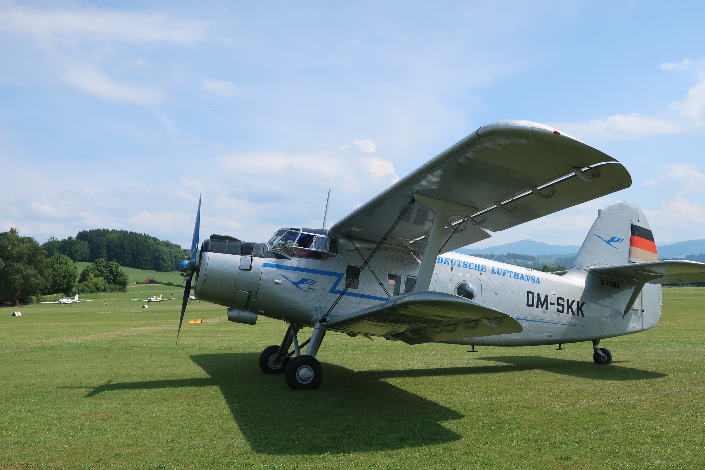 Antonov An-2 Doppeldecker auf dem Flugplatzfest 90 Jahre Kempten-Durach (EDMK) kurz vor dem Start.